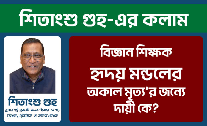 আলোচিত বিজ্ঞান শিক্ষক হৃদয় মন্ডল মারা গেছেন (শনিবার ৪ঠা মার্চ ২০২৬)। তাঁর বিদেহী আত্মার শান্তি কামনা করি। তিনি স্বাভাবিক মৃত্যু-বরন করেছেন, কেউ তাঁকে খুন করেনি। আসলে কি তাই? ইসলাম ধর্ম অবমাননার অভিযোগে ২০২২ সালের ২২শে মার্চ হৃদয় মন্ডল গ্রেফতার হ’ন, ১৯দিন কারাগারে থেকে তিনি ১০ই এপ্রিল মুক্তি পান। ১৬ই আগষ্ট ২০২২ তাঁকে ধর্ম অবমাননা মামলা থেকে অব্যাহতি দেয়া হয়। মস্তিষ্কে অতিরিক্ত রক্তক্ষরণে তাঁর মৃত্যু ঘটে। ভাল শিক্ষক হিসাবে তাঁর সুনাম ছিলো। বিনোদপুর রাজকুমার উচ্চ বিদ্যালয়ে তিনি সিঁকি শতাব্দী বিজ্ঞান ও গণিতের শিক্ষক ছিলেন। মৃত্যুকালে তাঁর বয়স হয়েছিলো ৫৮, তিনি স্ত্রী, পুত্র ১৪, কন্যা ১০ রেখে যান। এ মৃত্যুকে কি অকাল মৃত্যু বলা যায়?