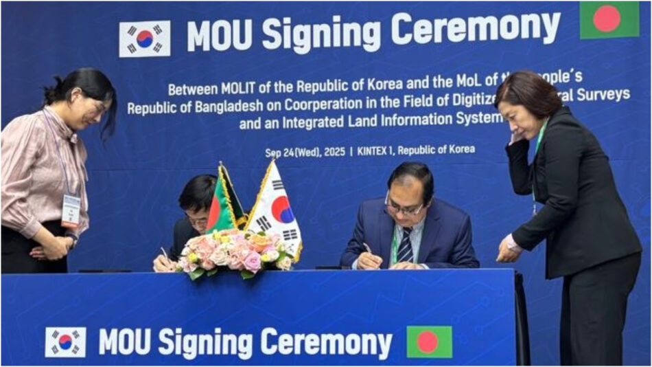 দক্ষিণ কোরিয়ার ভূমি, অবকাঠামো ও পরিবহন মন্ত্রণালয় এবং বাংলাদেশ সরকারের ভূমি মন্ত্রণালয়ের মধ্যে ডিজিটাইজড ক্যাডাস্ট্রাল সার্ভে ও সমন্বিত ভূমি তথ্য ব্যবস্থাপনা সিস্টেম বাস্তবায়ন বিষয়ে একটি সমঝোতা স্মারক (এমওইউ) স্বাক্ষরিত হয়েছে। এর মাধ্যমে দেশে ভূমিসেবায় নতুন দিগন্তের উন্মোচন হলো বলে জানিয়েছে ভূমি মন্ত্রণালয়।