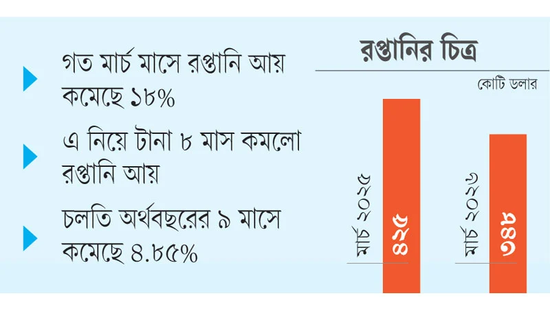 রপ্তানির এই টানা পতনের কারণ বিশ্লেষণে দেখা যায়, মার্কিন পাল্টা শুল্ক এবং শুল্ক কেন্দ্র করে প্রতিযোগী দেশগুলো জোটগত প্রধান বাজার ২৭ জাতির জোট ইউরোপীয় ইউনিয়নে অগ্রাসী রপ্তানি বাণিজ্য করছে। কম দামে পণ্য রপ্তানি করা হচ্ছে ওই দেশগুলোতে। এ কারণে গত ৮ মাস ধরেই বাংলাদেশের রপ্তানি কমছে। এসব কারণের সঙ্গে ঈদুল ফিতর উপলক্ষে